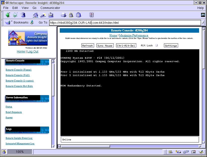 1. Turn on the virtual console by selecting 'Remote Console (2-cursor) under the "Remote Console" section. This starts a Java applet that will show you exactly what is being displayed on the console, for example, the memory self check, BIOS startup, SCSI probe, etc. If you have a Compaq SmartArray card, you can click on the button to send an F10 keypress.